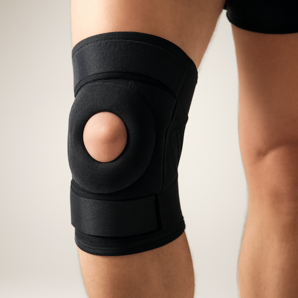 설명: 스트랩형은 슬개건(무릎 앞쪽 힘줄) 가쪽에 압력을 가해 힘의 방향을 바꿔줌. 달리면서 생기는 무릎 앞쪽 통증(patellofemoral pain)에 자주 쓰임. 패드형은 슬개골 아래나 가쪽에 실리콘/폼 패드가 있어 충격 분산 역할을 함.