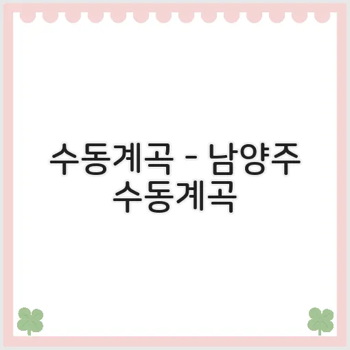 수동계곡은 경기도 남양주시에 위치해 있습니다. 이곳은 아름다운 자연경관과 맑은 계곡수로 인기가 많습니다.