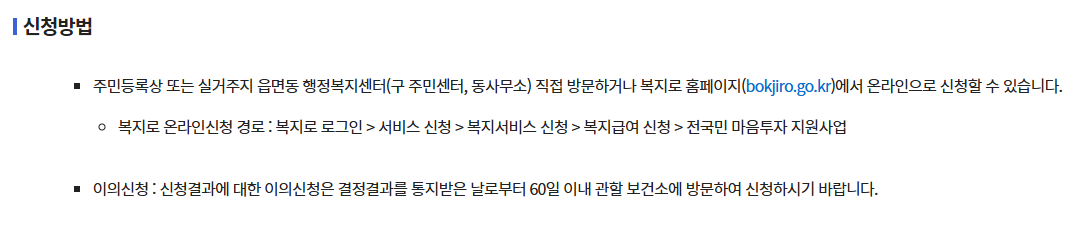 지금 바로 주민센터를 방문하거나 전국민 마음투자 지원사업 신청을 통해 신청해보세요. 더 나은 내일을 위해, 전국민 마음투자 지원사업이 여러분과 함께합니다.