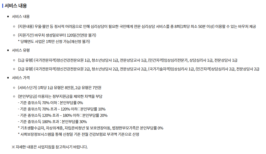 - 바우처 사용 기간은 발급 후 120일이며, 지정된 심리 상담 기관에서 이용 가능합니다.