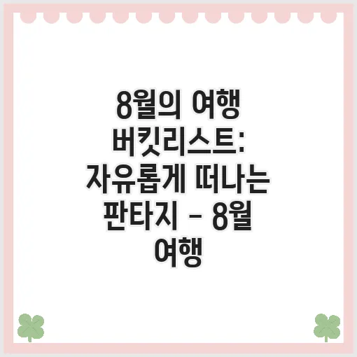 여름의 끝자락인 8월은 많은 사람들이 기다려온 여행의 기회를 제공하는 특별한 시기입니다. 이번 블로그 포스팅에서는 다양한 8월 여행의 매력과 함께 나만의 여행 버킷리스트를 작성하는 법, 그리고 자유롭게 떠나는 판타지 여행의 아이디어를 공유하고자 합니다. 여름이 주는 자유로움을 만끽하면서 새로운 장소를 탐험할 준비가 되셨나요? 그럼 시작해보겠습니다!